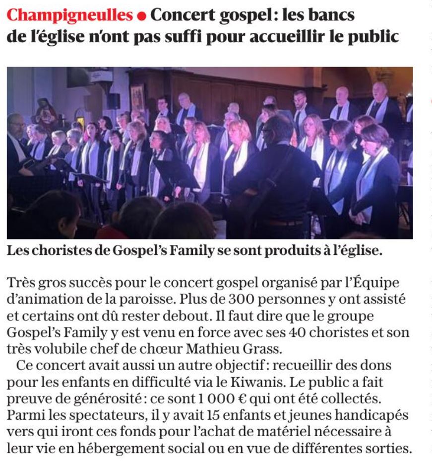 Très gros succès pour le concert gospel organisé par l’équipe d’animation de la paroisse. Plus de 300 personnes y ont assisté et certains ont dû rester debout. Il faut dire que le groupe Gospel’s Family y est venu en force avec ses 40 choristes et son très volubile cher de chœur Matthieu Grass.