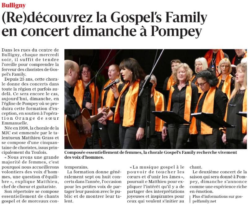 Dans les rues du centre de Bulligny, chaque mercredi soir, il suffit de tendre l’oreille pour comprendre la ferveur des choristes de Gospel’s Family.